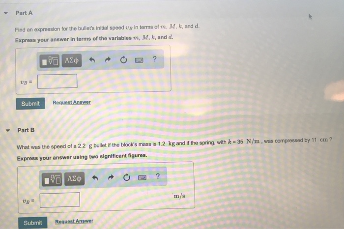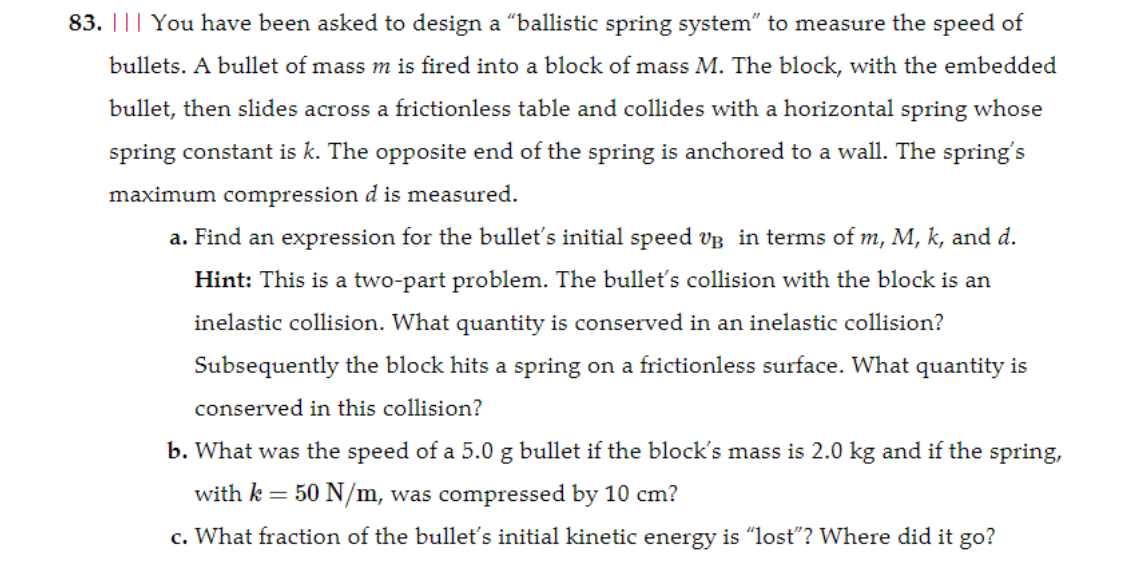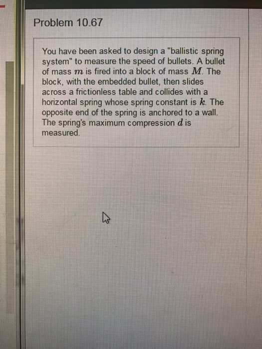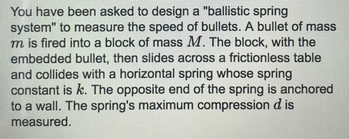 The springs maximum compression d is measured. A block of mass M hangs from the spring. Mastering Physics 1067 You have been asked to design a ballistic spring system to measure the speed of bullets.