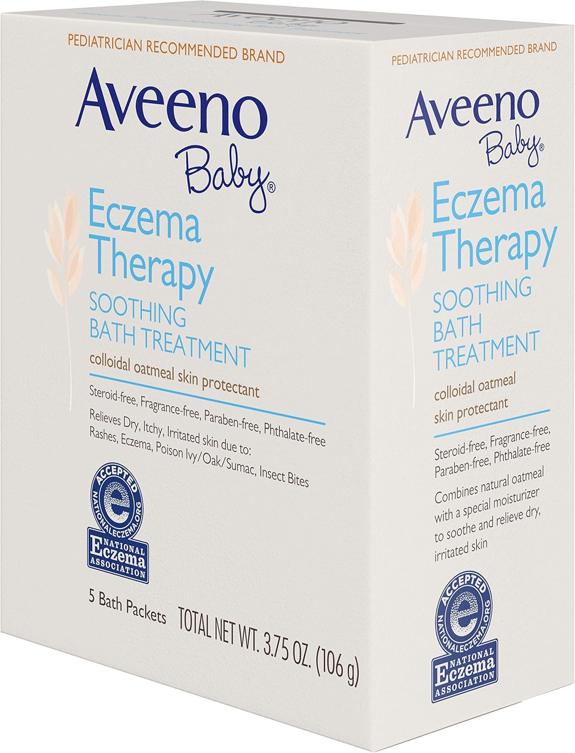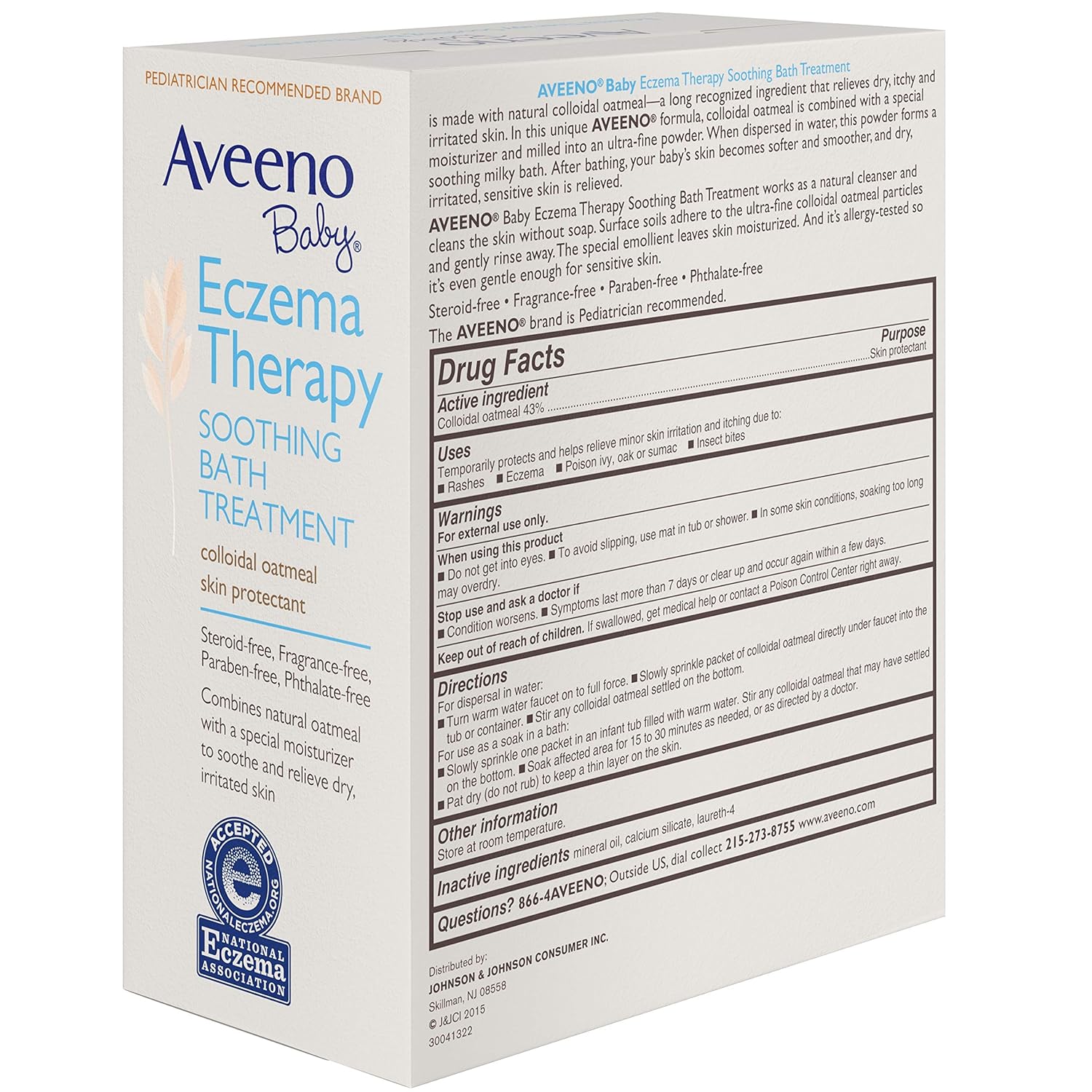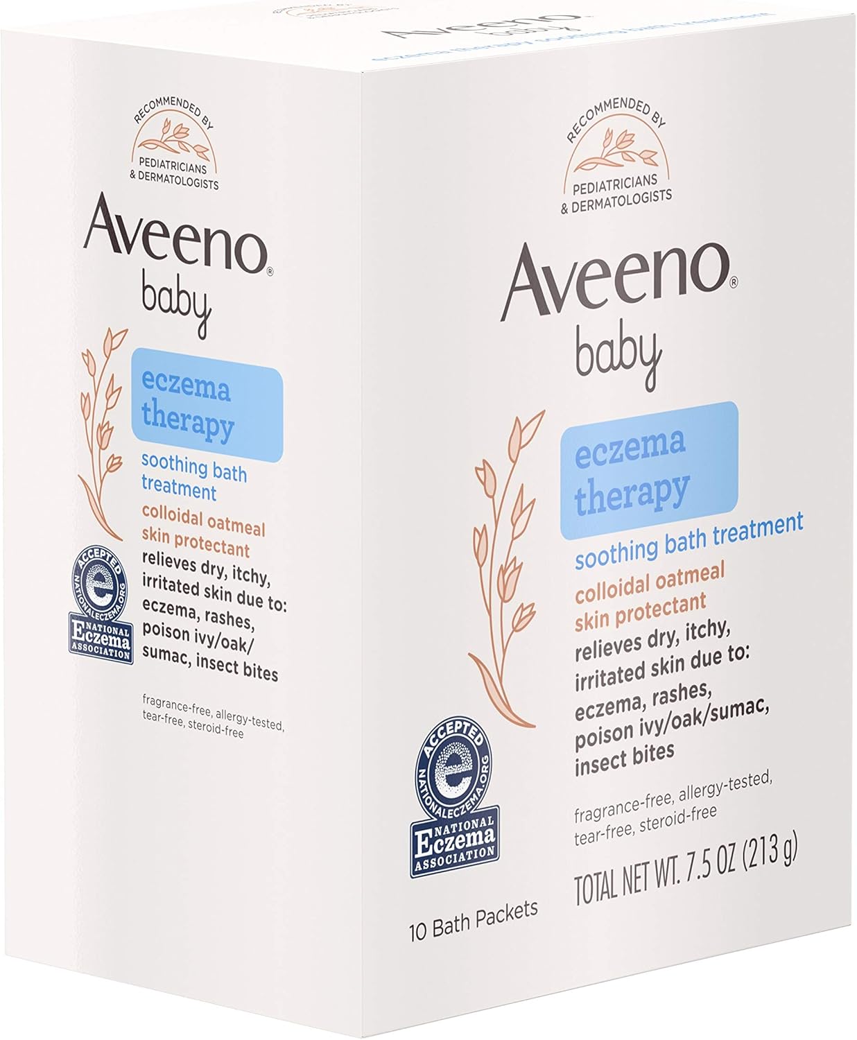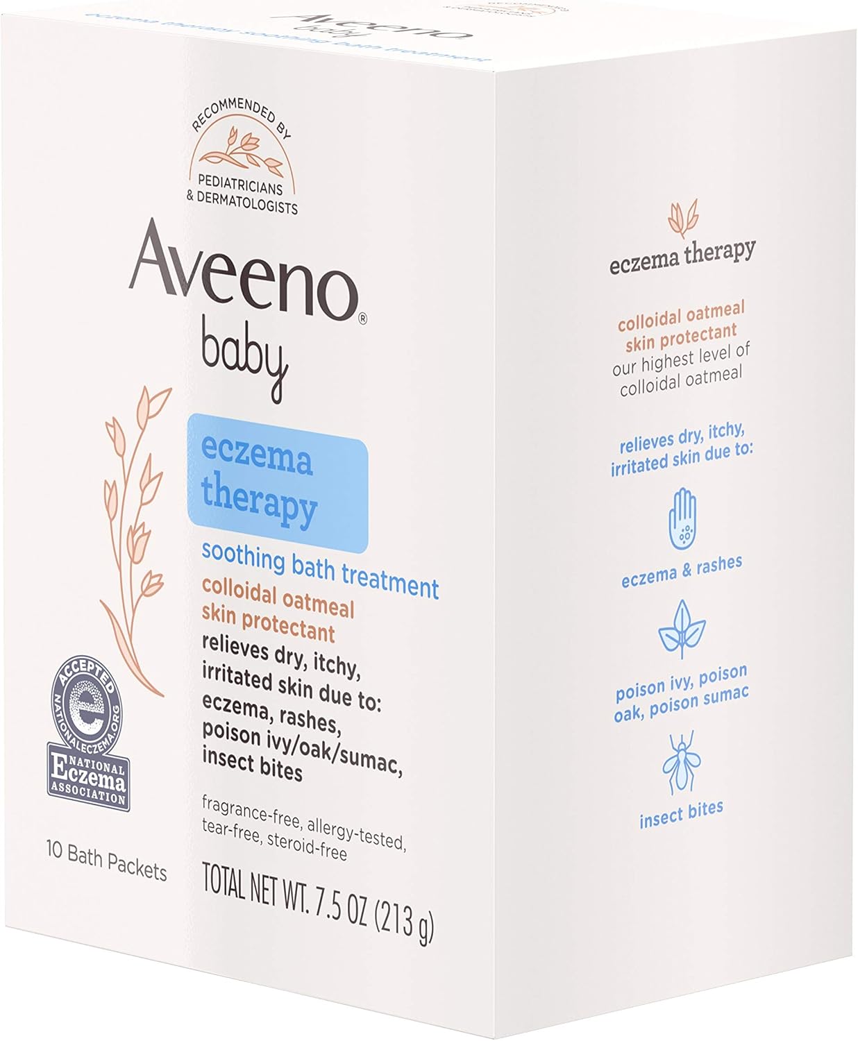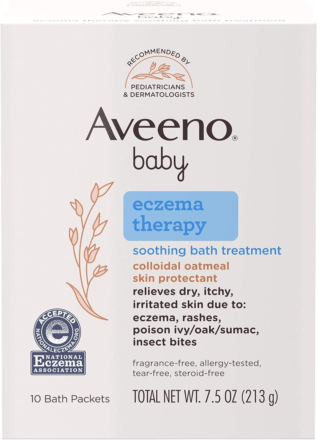 Aveeno Eczema Therapy Baby Soothing Bath Treatment helps relieve minor skin irritation and itching caused by rashes eczema poison ivyoaksumac or insect bites. Fragrance-free allergy tested tear-free steroid free. LOOK Same Great Formula.