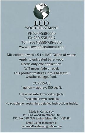 It is available in New Zealand and Australia from Harm Less Solutions Limited and our distributors. Eco wood stain 1 gallon brown. PO BOX 430 Bridgewater NS B4V-2X6. It is available in New Zealand and Australia from Harm Less Solutions Limited and our distributors. Enhance your woods natural beauty and leave a silver patina finish. Can be used in exterior or interior applications eco wood treatment mixes completely with waterno inert particles are added. Intl eco wood treatment now operates globally. Watch this 2 minute video of an outdoor wood finishing product that you only need to apply once. Intl eco wood treatment is a leading brand form Canada.