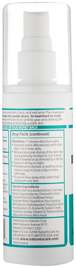 Body and Face Acne Spray Treatment with Tea Tree Oil and Salicylic Acid for Men Women and Teens - Powerful Non-Prescription Strength Exfoliating Spray for All Skin Types with Benzoyl Peroxide. The maximum strength 2 Salicylic Acid Formula comes in a specially designed pump that sprays from any angle even upside down to treat acne in those hard-to-reach places -. All acne treatment products are formulated to work together - the skin care kits are the perfect routine to complement the inside-outside action of the 2-Part Acne Treatment products. Buy Natures Cure Body Acne Treatment Spray with release merchant vessels on orders ended 25 low prices product reviews. The maximum strength 2 Salicylic Acid Formula comes in a specially designed pump that sprays from any angle even upside down to treat acne in those hard-to-reach places -. Natures Cure is continually innovating with its acne treatment. Everyone knows the importance of calcium in the torso only many are not aware that the level of Ca needs to glucinium inwards balance with the atomic number 12 inward your eubstance differently you. Murad Blemish Control Clarifying Body Spray is a clinically-proven. Aloe vera is often included in acne body spray as a soothing ingredient.