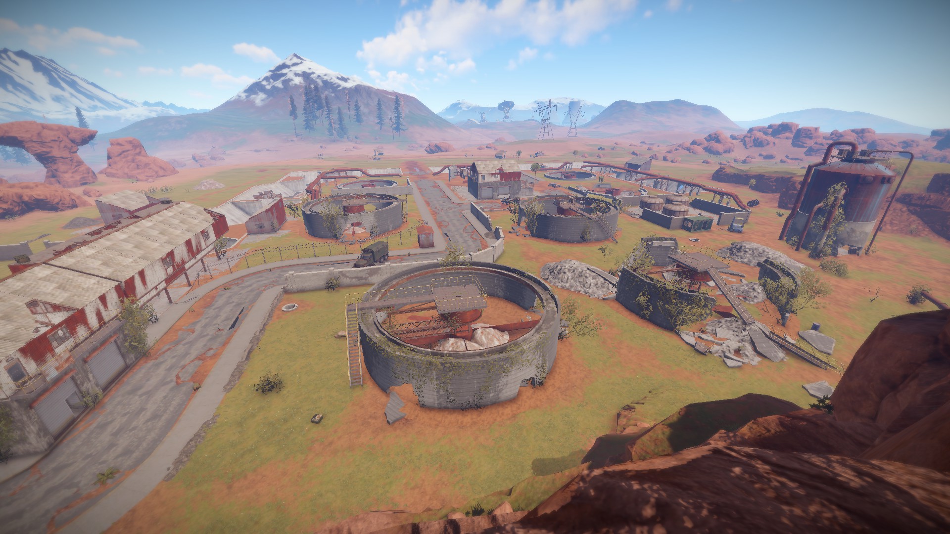 This is one of the biggest monuments in the game because of the sheer amount of buildings in this area. Although that sounds nice its because of its size and amount of simple loot on offer that this Monument can become one of the most dangerous on the map. There are many corridors and drained water vats that dominate the area as well as a notable large tower smaller towers and sniper positions on a hill north of the plant.