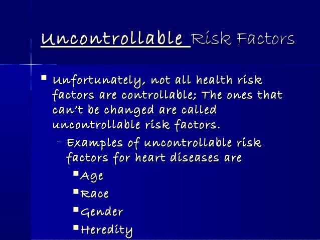 As the name suggests these cannot be controlled as they are present in the body by birth or by some natural reasons but yes they can be slowed down. Male gender Men have a greater risk of heart attack than women do and men have heart attacks earlier in life than women. Uncontrollable risk factors include.
