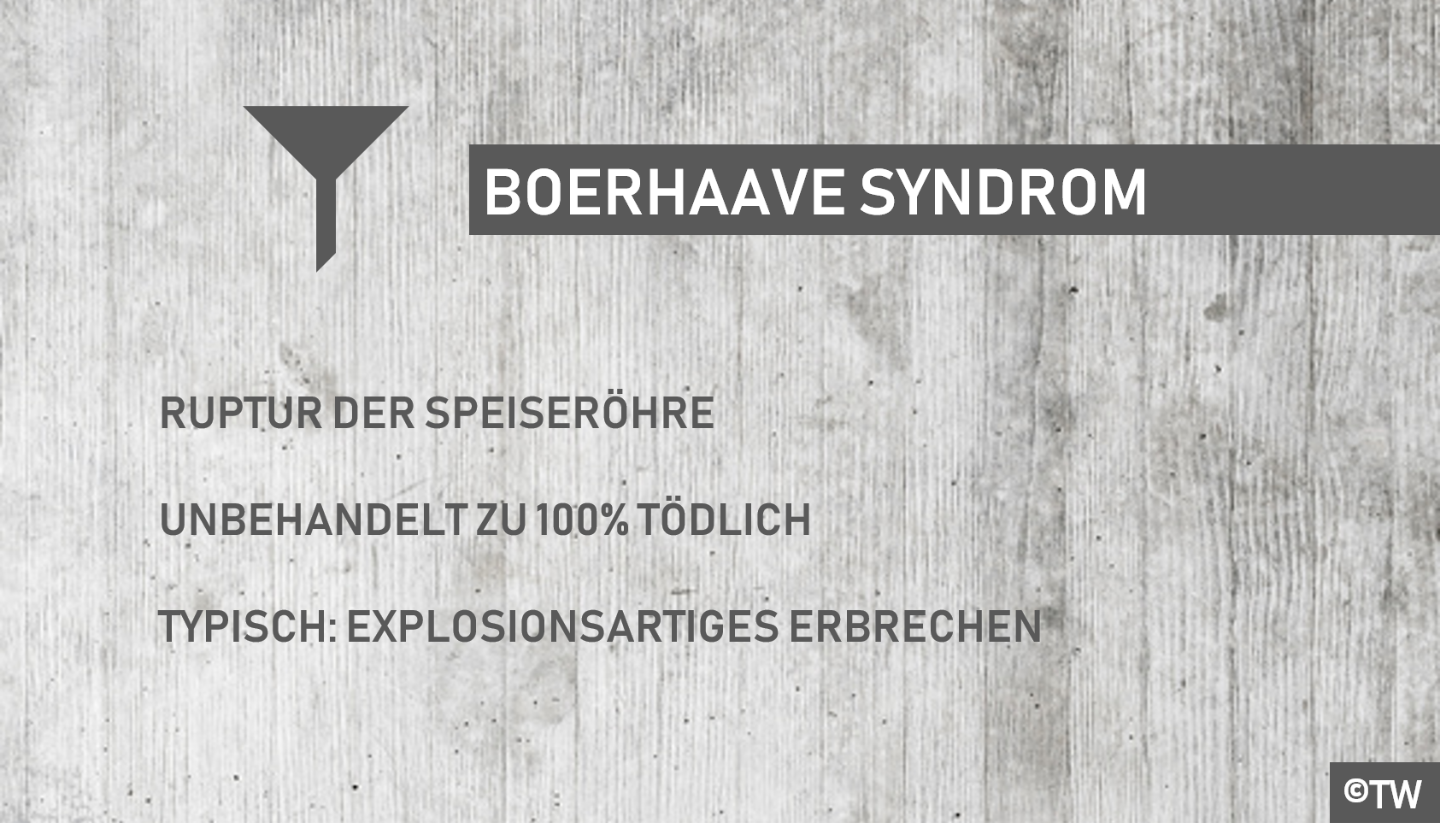 Dies wird fachsprachlich spontane Ösophagusperforation Ösophagus Speiseröhre Perforation Loch spontane Ösophagusruptur Ruptur Riss oder Boerhaave-Syndrom genannt.