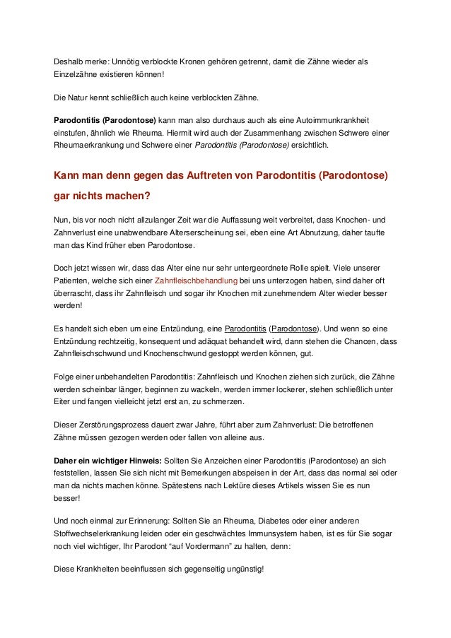Vor der Parodontose-Behandlung - wie hier im Bild - graust es vielen Patienten. Dann auch beim Kochen kein normales raffiniertes Speisesalz aus dem Supermarkt verwenden sondern ein nicht raffiniertes Steinsalz oder Meersalz aus dem Bioladen. Dieses dreckige Drittel in unserem Mund muss einmal täglich richtig gereinigt werden ganz genauso wie die anderen zwei Drittel. Parodontitis ohne Operation behandeln Für leichte und mittelschwere Parodontose ist dabei in der Regel keine Operation nötig geschlossene Parodontosebehandlung SRP. Biofilmmanagement und Stärkung des Immunsystems sind folglich die beiden tragenden Säulen einer sinnvollen Therapie. Der Schlüssel um die Parodontose dauerhaft zu stoppen ist ein täglich gepflegter Zahnzwischenraum. Dabei werden mehrere Zähne die locker bzw.