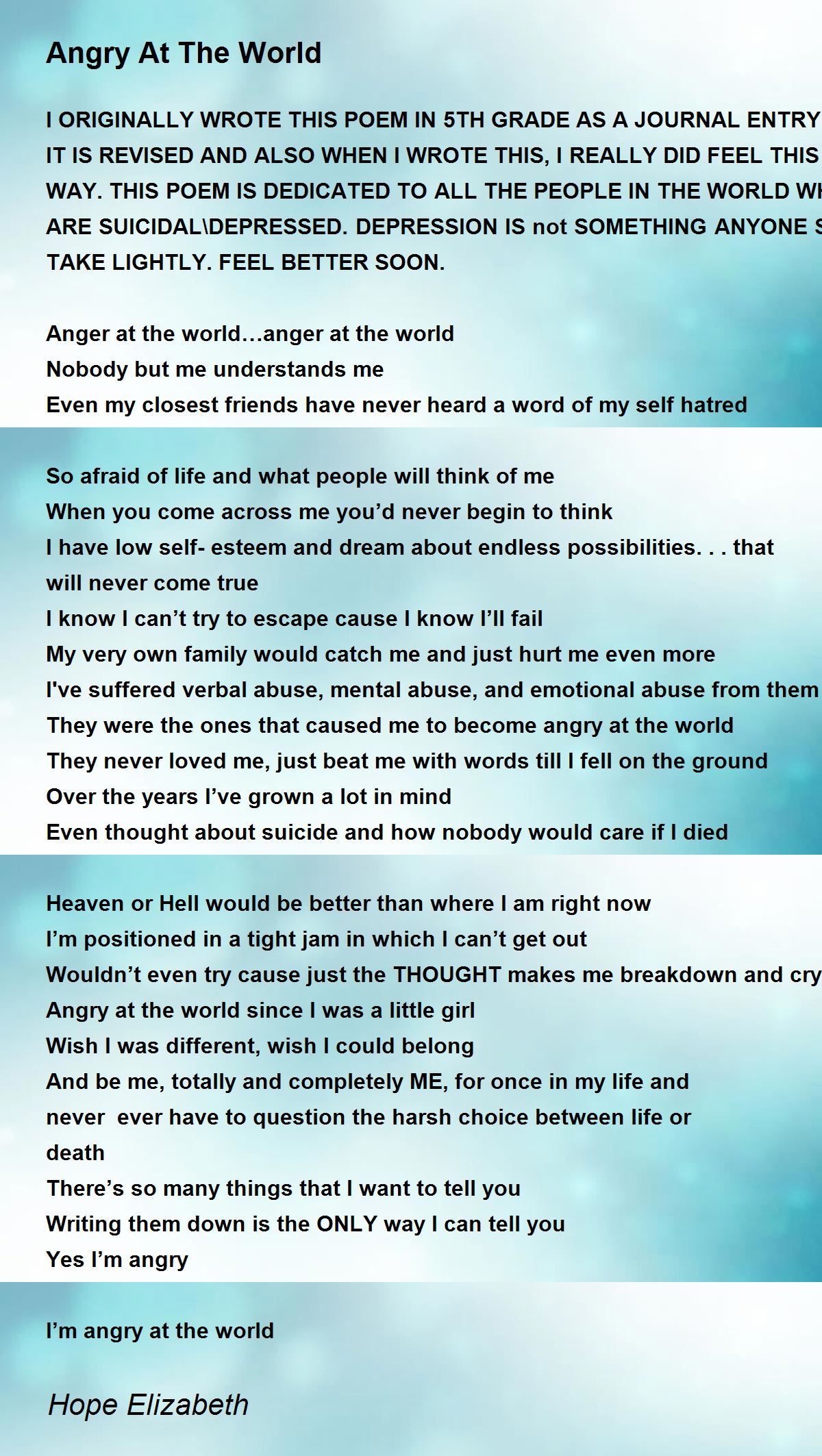 As intolerable as it is it is also the opportunity to completely vaccinate yourself from ever having happen again. He Knows your Pain and Worries. Abusers rely on the silence of their victims and at 16 I was too afraid to speak up and over 10 years later so many women still feel this way. As I wrote this I realized Im somewhat angry at myself for getting fucked up by the world. I envy the annoyingly positive people. And youll get all the space you could ever desire. Everyone has a moment in their life where they just look up towards the sky and project their rage at the whole world.